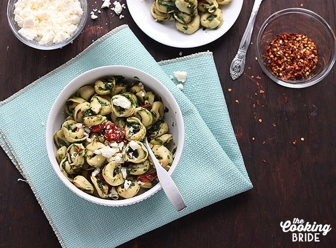 This tortellini sauce has a some Latin American flair. Tomatillos are roasted with garlic and olive oil, blended with fresh spinach and roasted tomatoes, then tossed with queso fresco cheese.